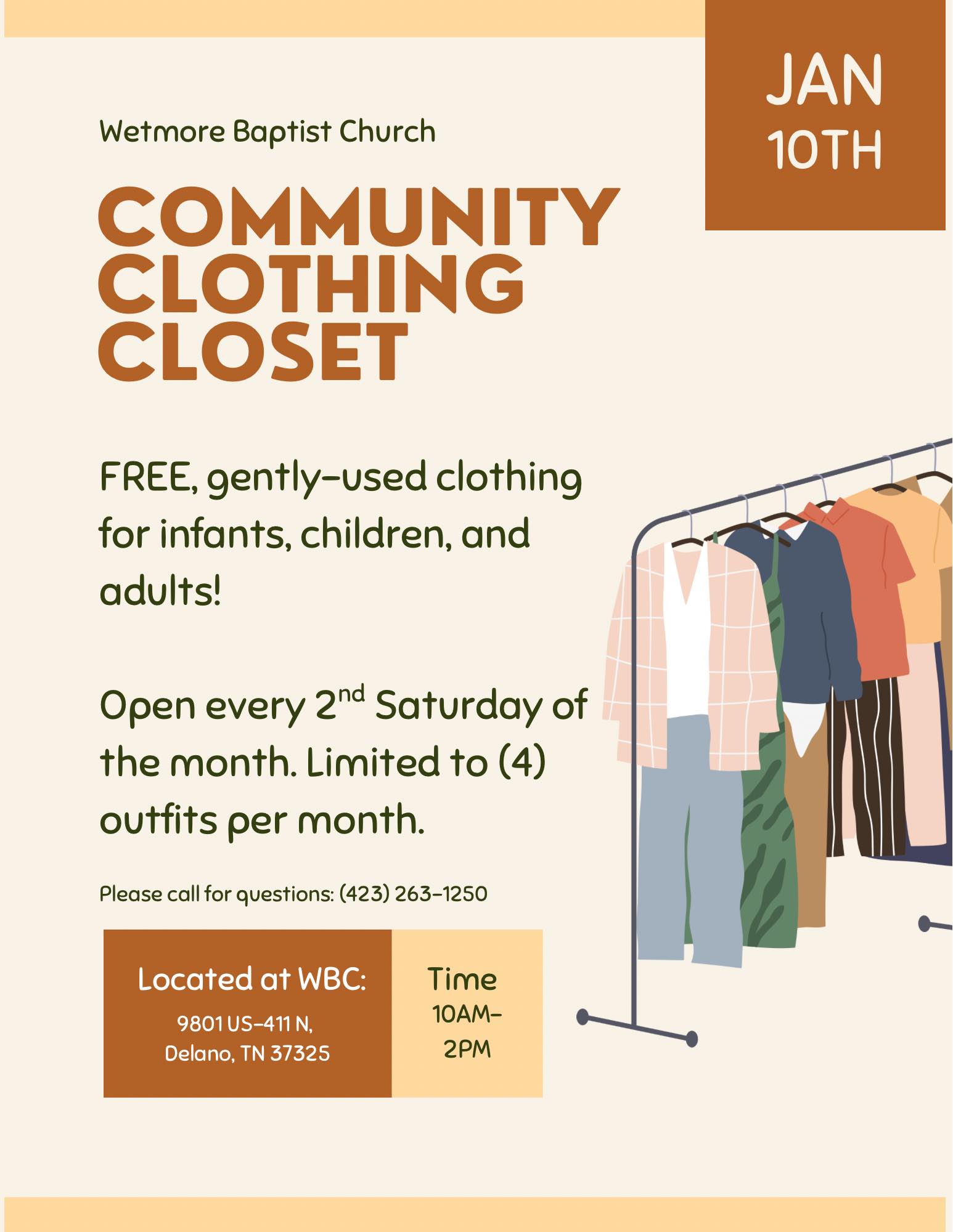 Join us this Saturday, January 10th from 10 AM to 2 PM at Wetmore Baptist Church for our clothing closet!