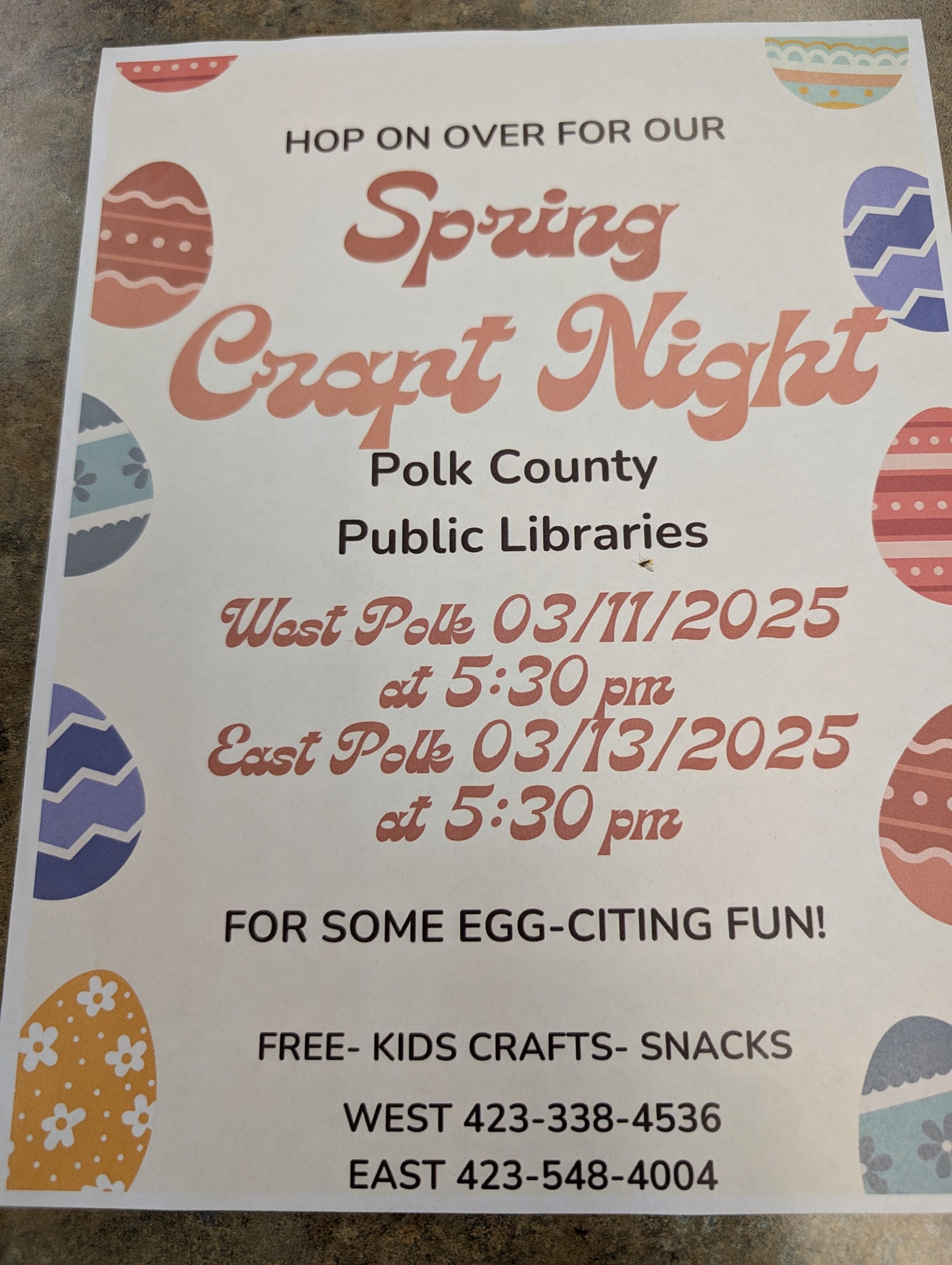 A children’s Spring craft night will be held at West Polk Library on March 11, 2025. Come out and have some fun!