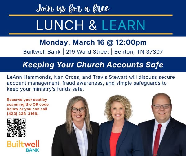 3/16 Lunch & Learn on Church Account Safety Benton, TN Builtwell Bank Your church’s finances support your mission. If you’re near our Benton office, join us for lunch as we share best practices to keep your accounts safe!