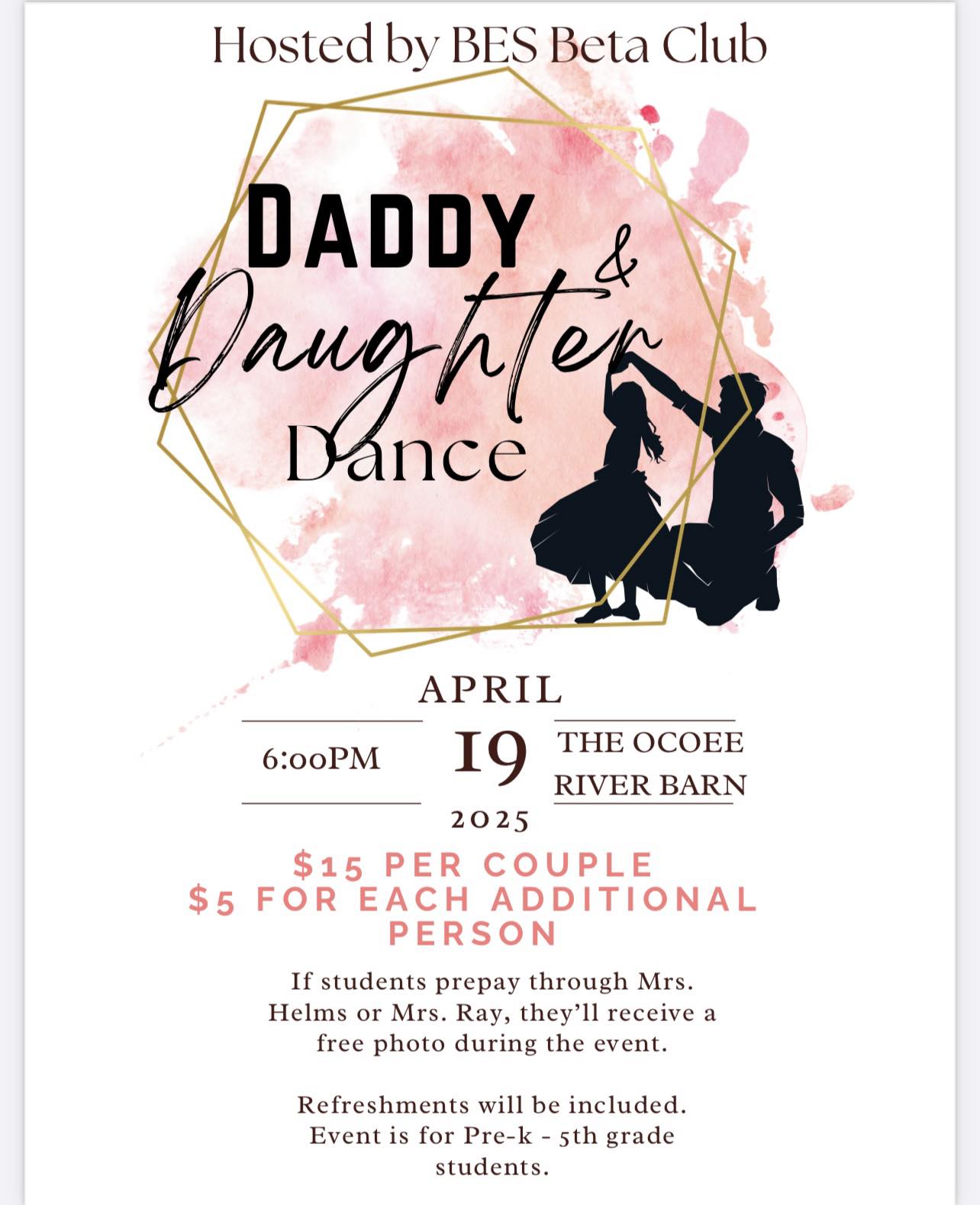Join us next Saturday for our annual Daddy Daughter Dance. The dance will be at a different venue this year: The Ocoee River Barn. Prepay this week at school and receive a free photo taken at the event.