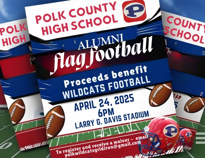Tickets will be $5 at the gate. The Wildcat Café will be in full operation – burgers and hot dogs, Davis Farms BBQ, loaded taters . . . we’ll have it all!! All proceeds will go directly to Polk County High School football to help us keep our football program an absolutely ‘NO fee required to play program’.
