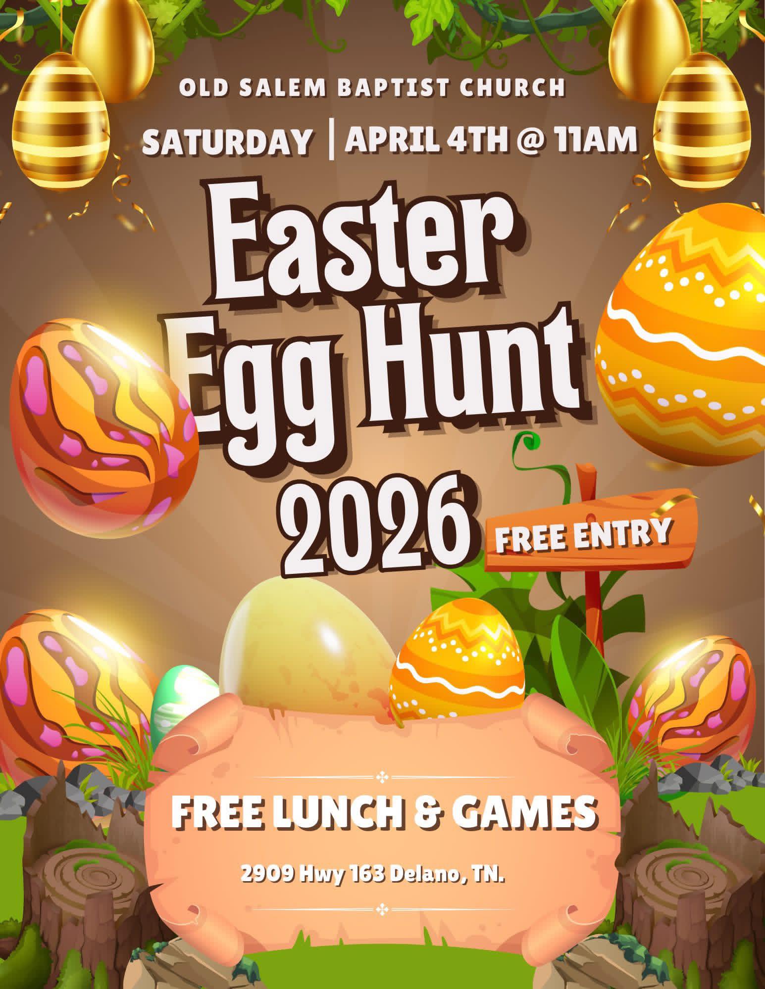 4/4 Community Egg Hunt Delano, TN Community Egg Hunt When: April 4th at 11:00 AM Where: Old Salem Baptist Church 2909 Hwy 163 Delano, TN Lunch will be provided following the egg hunt. We hope to see you there!
