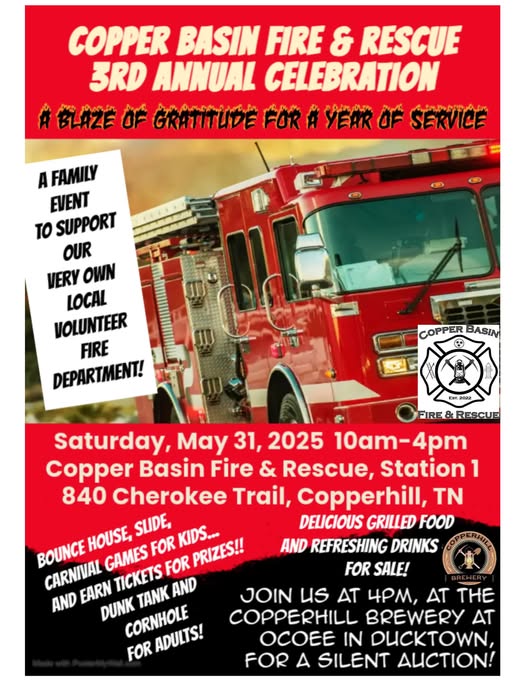 Come celebrate the Copper Basin Fire & Rescue Department’s 3rd annual with us! Enjoy fun games, a bounce house for the kids, and delicious hamburgers and hot dogs available for purchase. It’s a day for the whole community—don’t miss it!