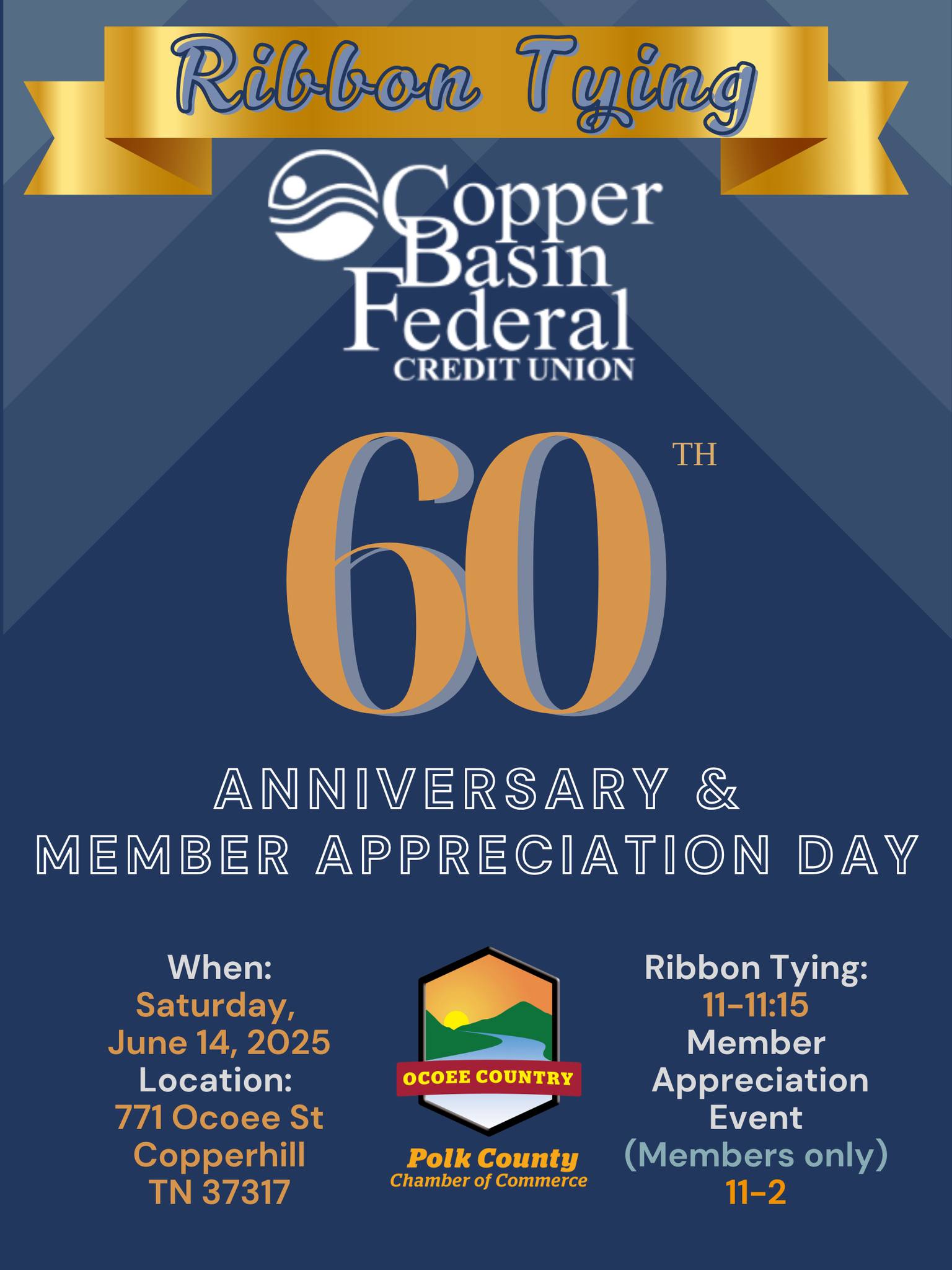 Join the Chamber of Commerce as they celebrate 60 years in the local community with Copper Basin Federal Credit Union! Credit union members are invited to stay for the afternoon Member Appreciation Event until 2pm.
