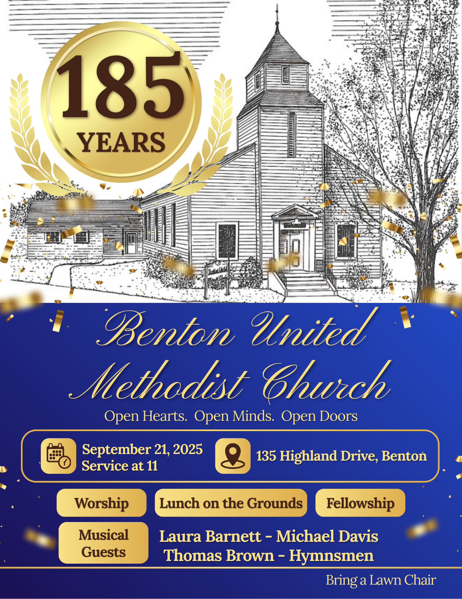 With hearts full of gratitude and joy, we invite you to join us in celebrating a remarkable milestone—185 years of faith, fellowship, and service at Benton United Methodist Church.