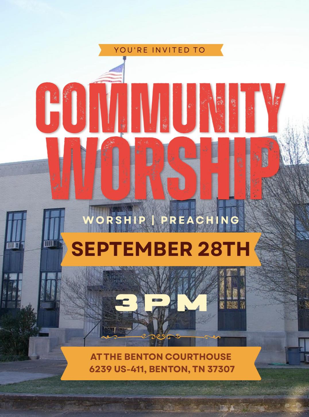 9/28 Community Time of Worship at the Courthouse Everyone welcome! Let’s come together for an afternoon of worship!Bring a lawn chair and enjoy some community time! for more info reach out to Darrell Grady