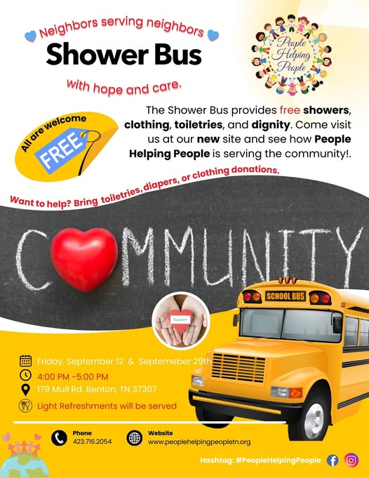 The Shower Bus provides free showers, clean clothes, toiletries, and dignity for anyone in need. This event will be at the future home of People Helping People (179 Mull Rd., Benton, TN 37307). Come see our new site and learn more about how PHP is serving the community!