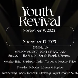 YOUTH REVIVALSAVE THE DATES NOV. 09, 2025 thru NOV. 13, 2025 TIME: SUNDAY 6:00 pm TIME: MON – THUR 7:00...